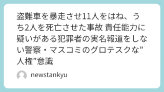 時評 盗難車を暴走させ11人をはね、うち2人を死亡させた事故 責任能力に疑いがある犯罪者の実名報道をしない警察・マスコミのグロテスクな人権意識