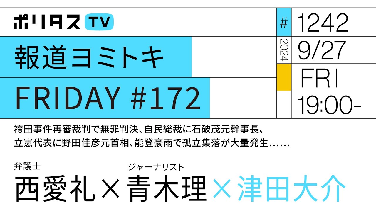 津田「まずですね、えっと本日は、冒頭にお時間いただいて、えー…2週間前の報道ヨミトキFRIDAY…青木さんが出演された、えー…報道ヨミトキFRIDAYの冒頭部分の発言に対するお詫びを申し上げます…(中略)…そこでですねえー…告知をしたときにですねえー…青木さんがまあ茶々を入れるような形っていえばいいんですかね、えー…まあその…あの…この『人々はなぜ自民党に入れ続けるのか』いまこの総選挙を前にね、まあ気になっている方も多かったと思うんですけれども、まあその理由として、えー…まあ青木さんがこの日本人がまあ劣等民族だからじゃないかっていう指摘をされました。まあその発言があのー…出てきた文脈とか経緯っていうのはまあそれなりにいろいろあるんですけれども、ただまあやはり、えー…日本人というですね総体を指して、また民族というですねえー…キーワードで否定的にえー…総体的に語ったことはですね、えー…これまあネガティブな言葉の強さという点でも、えー…文脈の欠如という点でも、えーまあ初めて見る視聴者にとってもまあ唐突であったという点でも不適切であったと認識しています…(中略)…改めて皆さん申し訳ありませんでした。ではちょっと、この件について青木さんからも一言お願いします。」