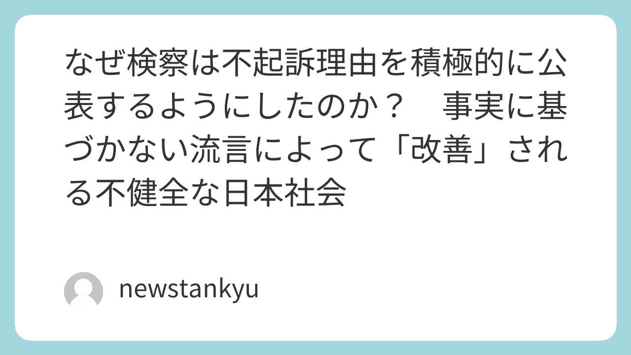 おそらく先の金沢地検の発表はアドバルーン(正式な決定前に世論の反応を探るために意図的に流される情報)で、実際は検察庁全体としてすでに不起訴理由を可能な限り公表する方針が決まっていたのだろう。